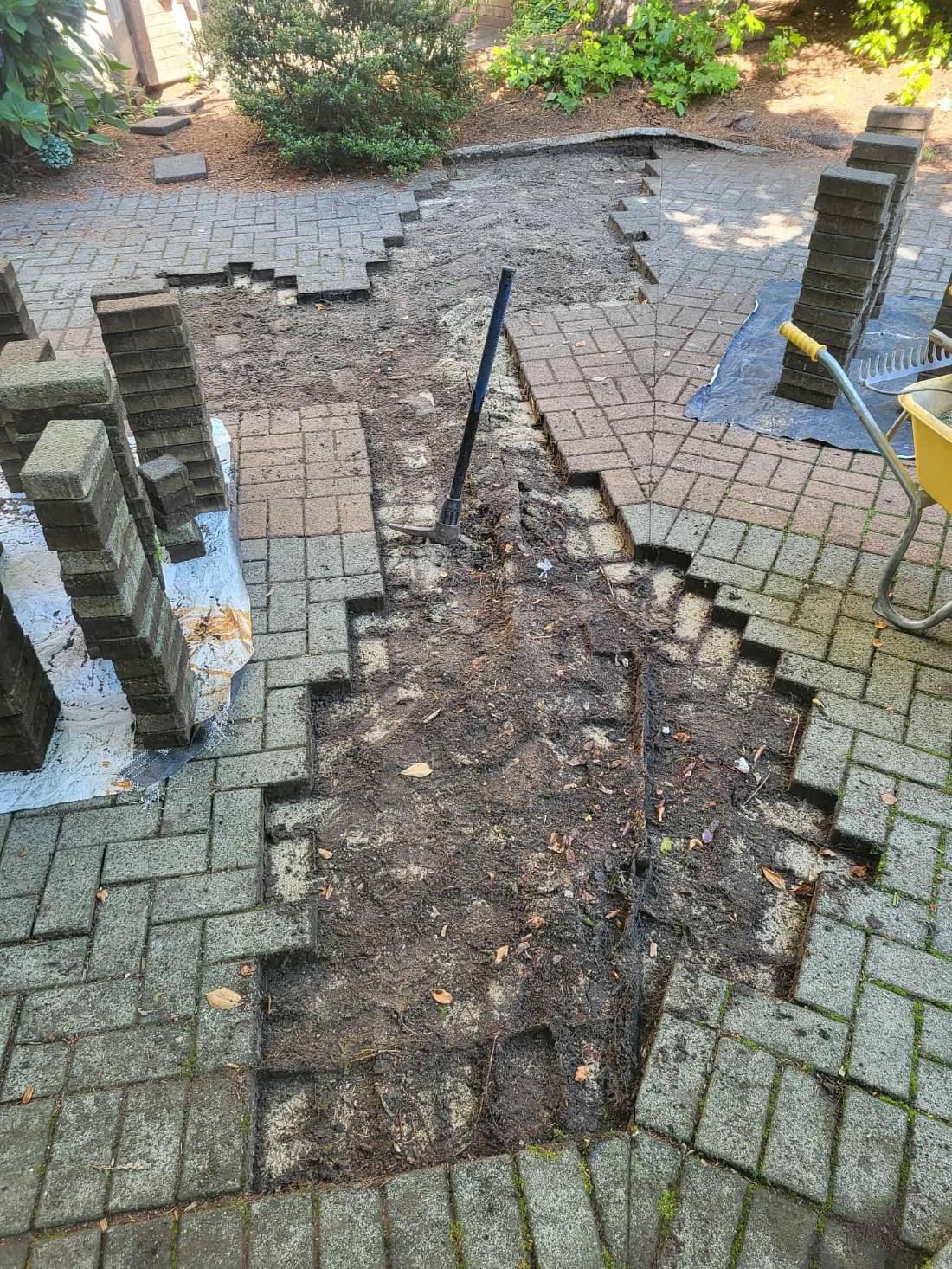 A walkway repair job due to tree root growth. Roots removed, pavers put back and area cleaned up.
