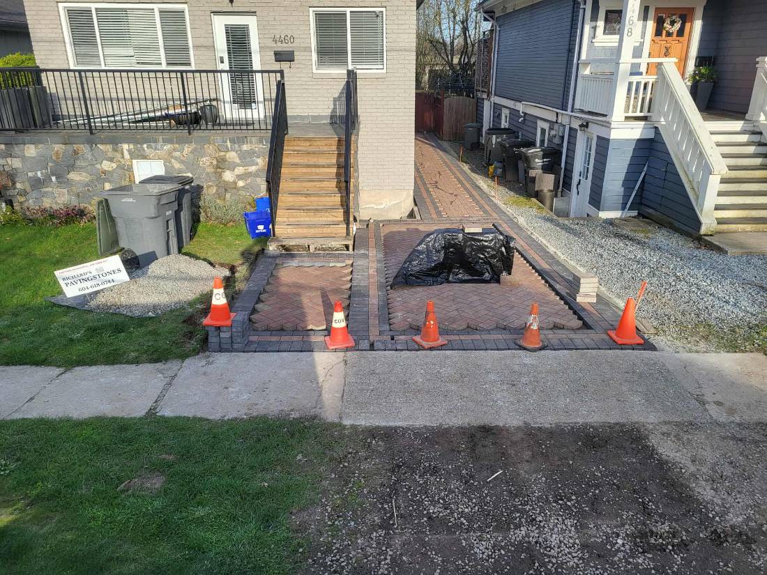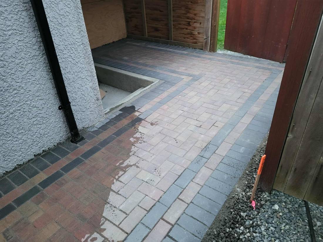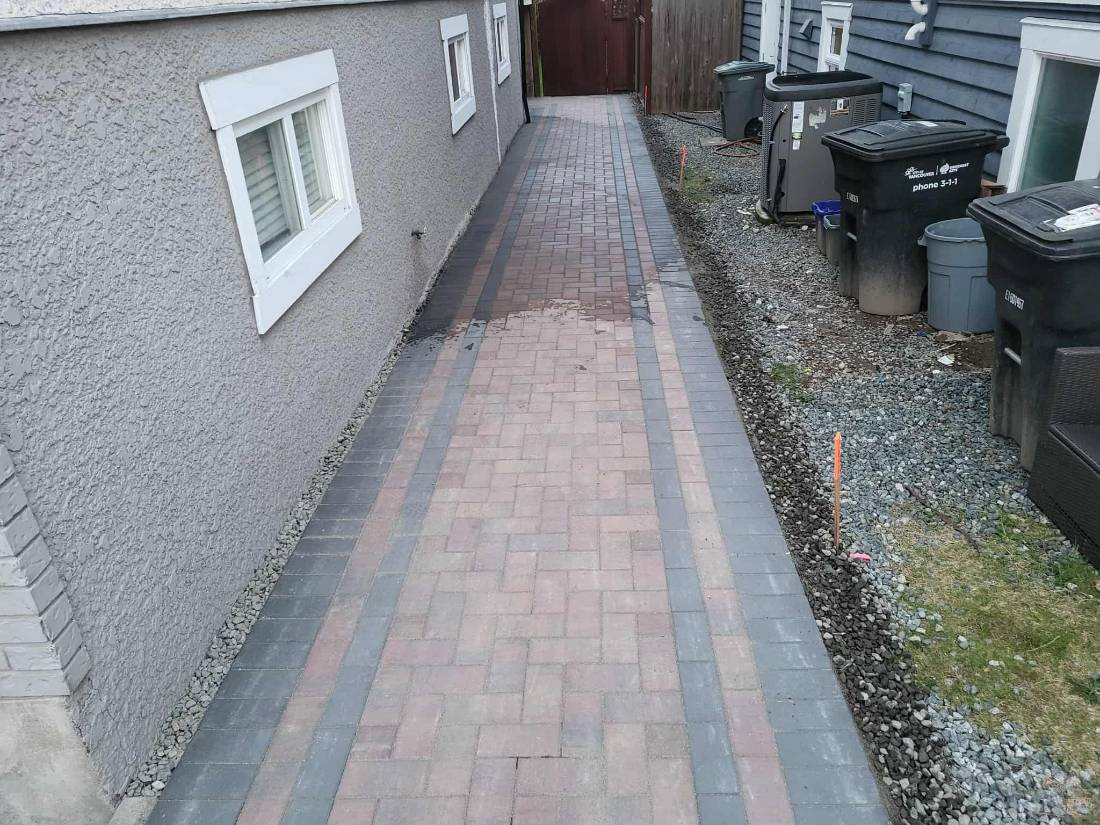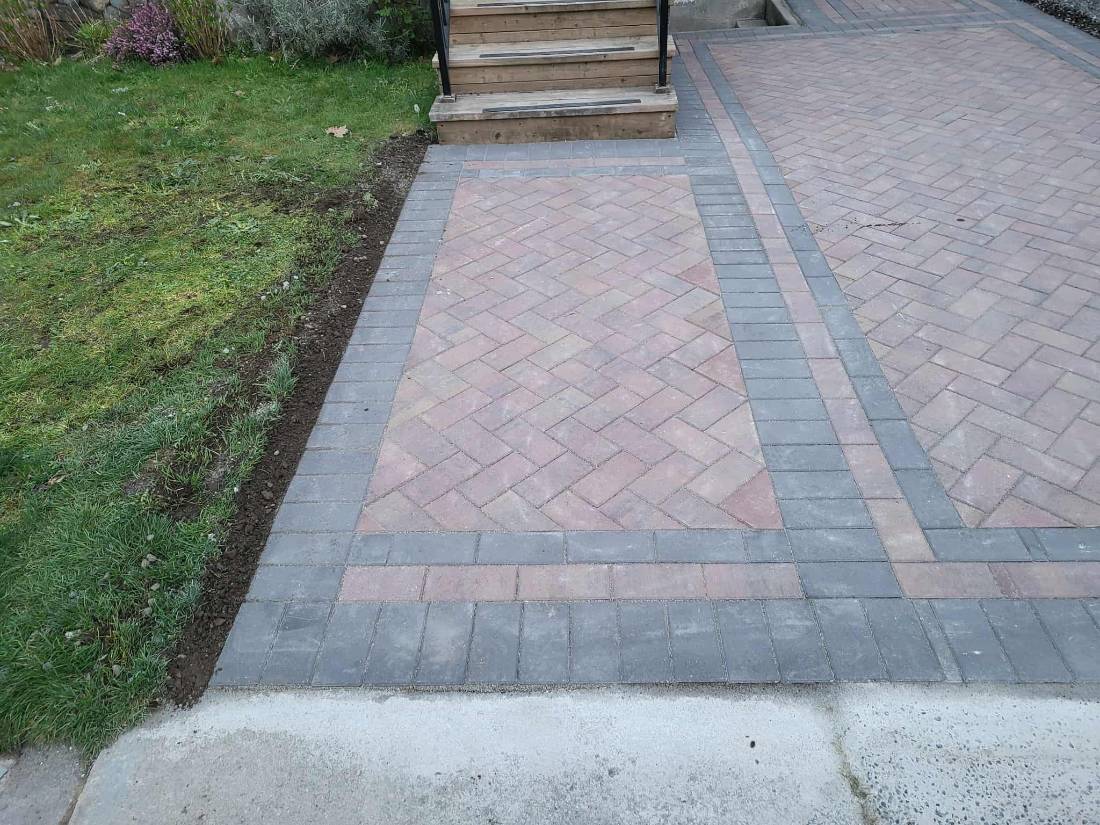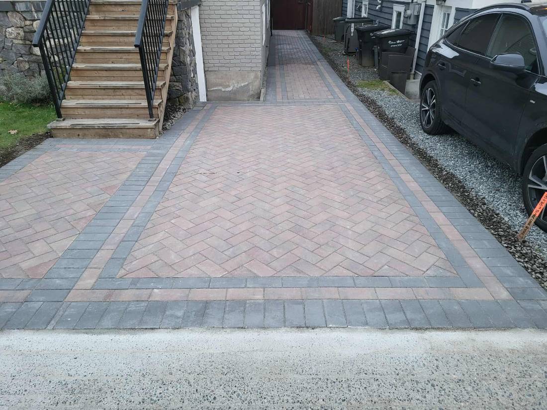 Area was all gravel beforehand. Graded by bobcat, applied screeding sand, and installed 45 degree herringbone pattern per customer request, with a border separating each area (Front landing, parking spot, and walkway).